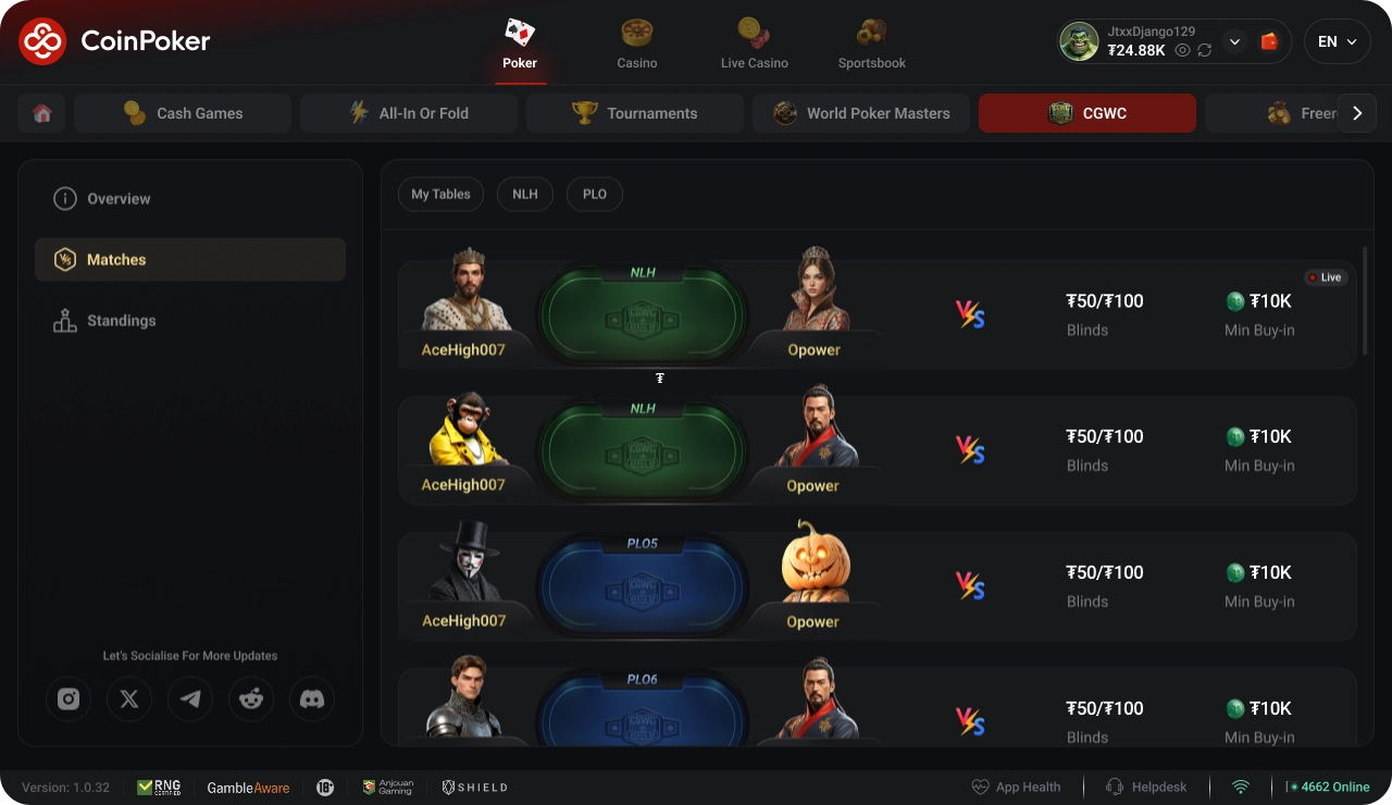 • В турнире Heads Up CGWC доступно ограниченное количество мест для игроков. Допуск участников к мероприятию осуществляется по усмотрению CoinPoker.